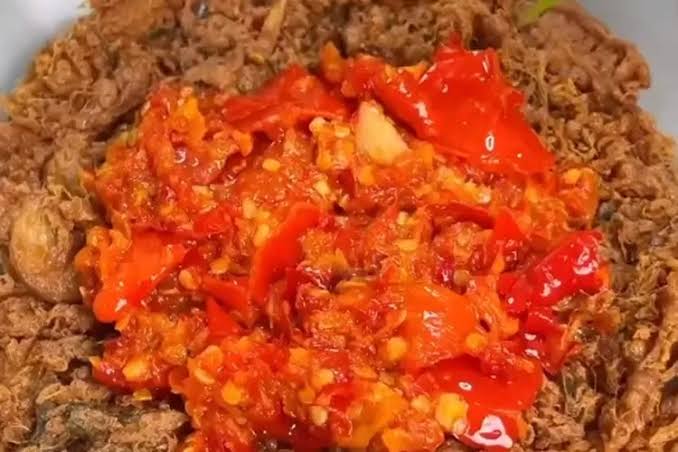 Telur dadar goreng garing dengan sambal khas mahoni